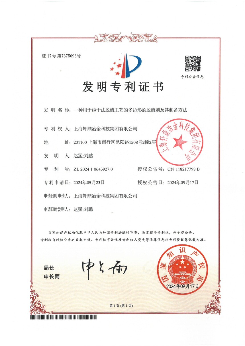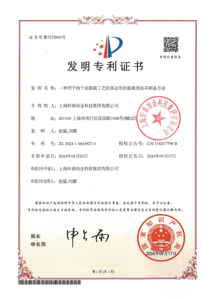 | 35 | 发明专利 | 一种用于纯干法脱硫工艺的多边形的脱硫剂及其制备方法 | ZL2024 1 0643927.0 |